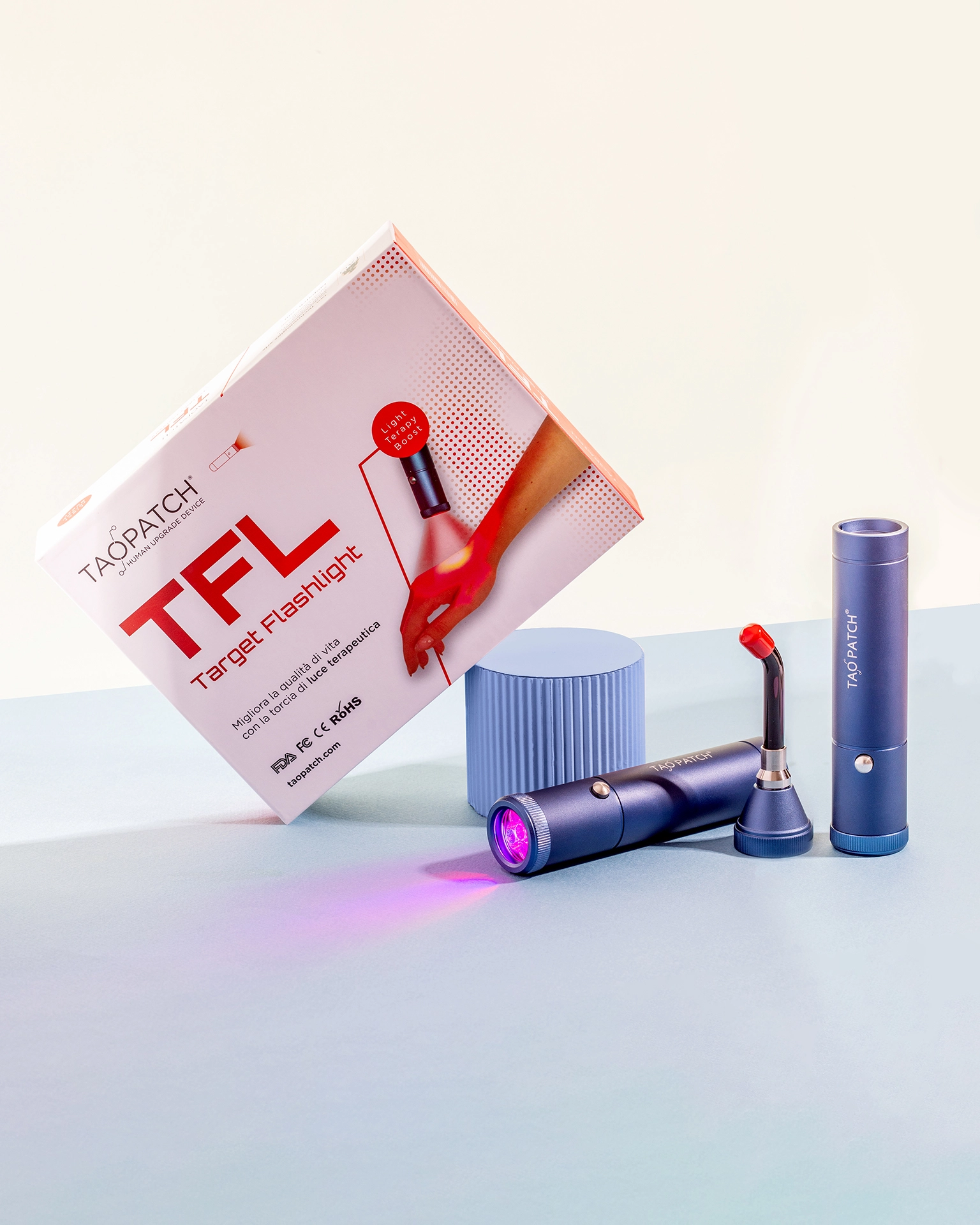 La TFL (Target Flashlight) es una linterna de uso complementario al sistema Taopatch®, diseñada para activar o potenciar la estimulación fotónica de los parches. Emite una frecuencia de luz infrarroja específica que ayuda a «activar» o enfocar la acción de los dispositivos Taopatch®, especialmente útil al iniciar el uso o durante protocolos intensivos.